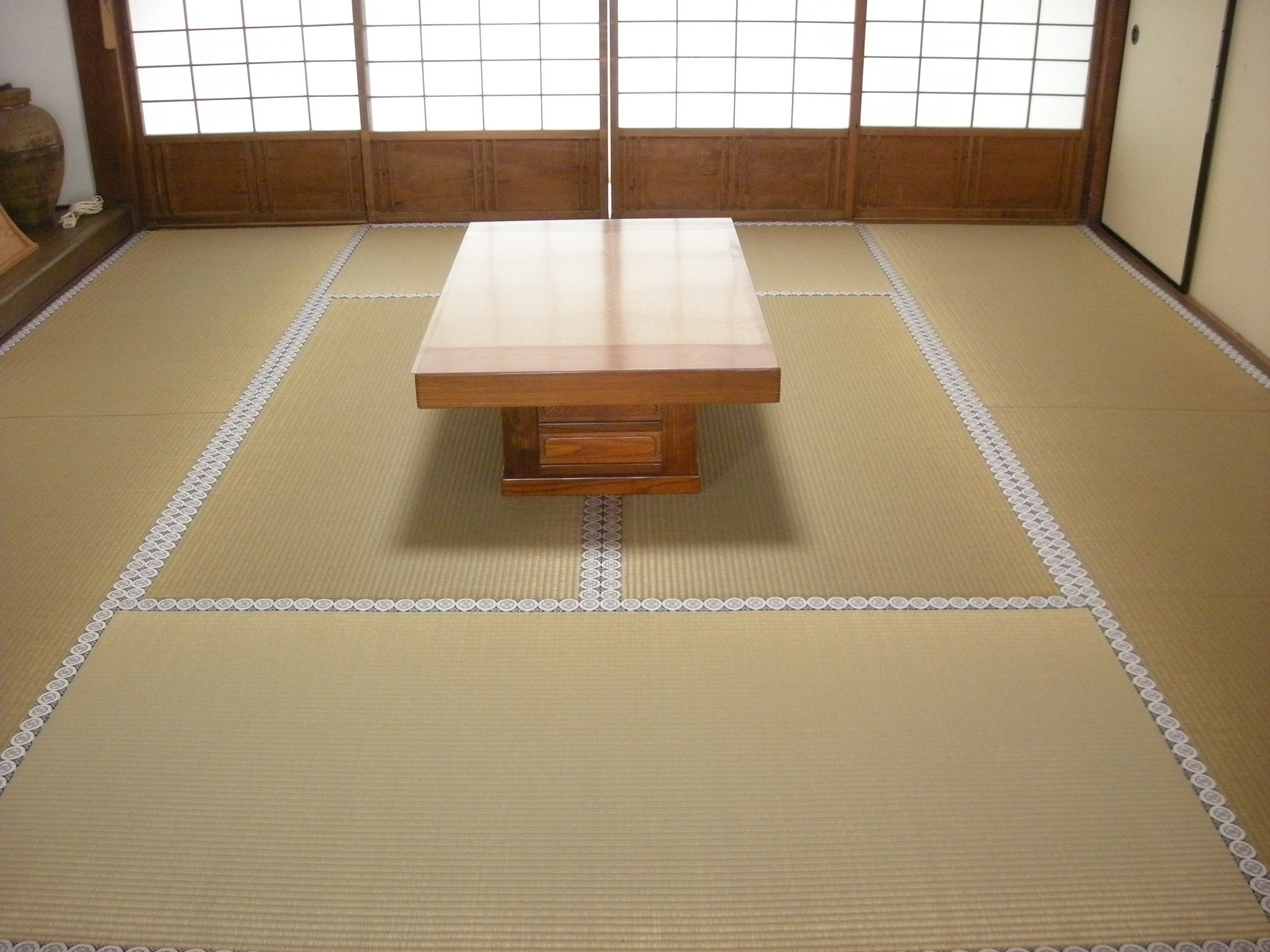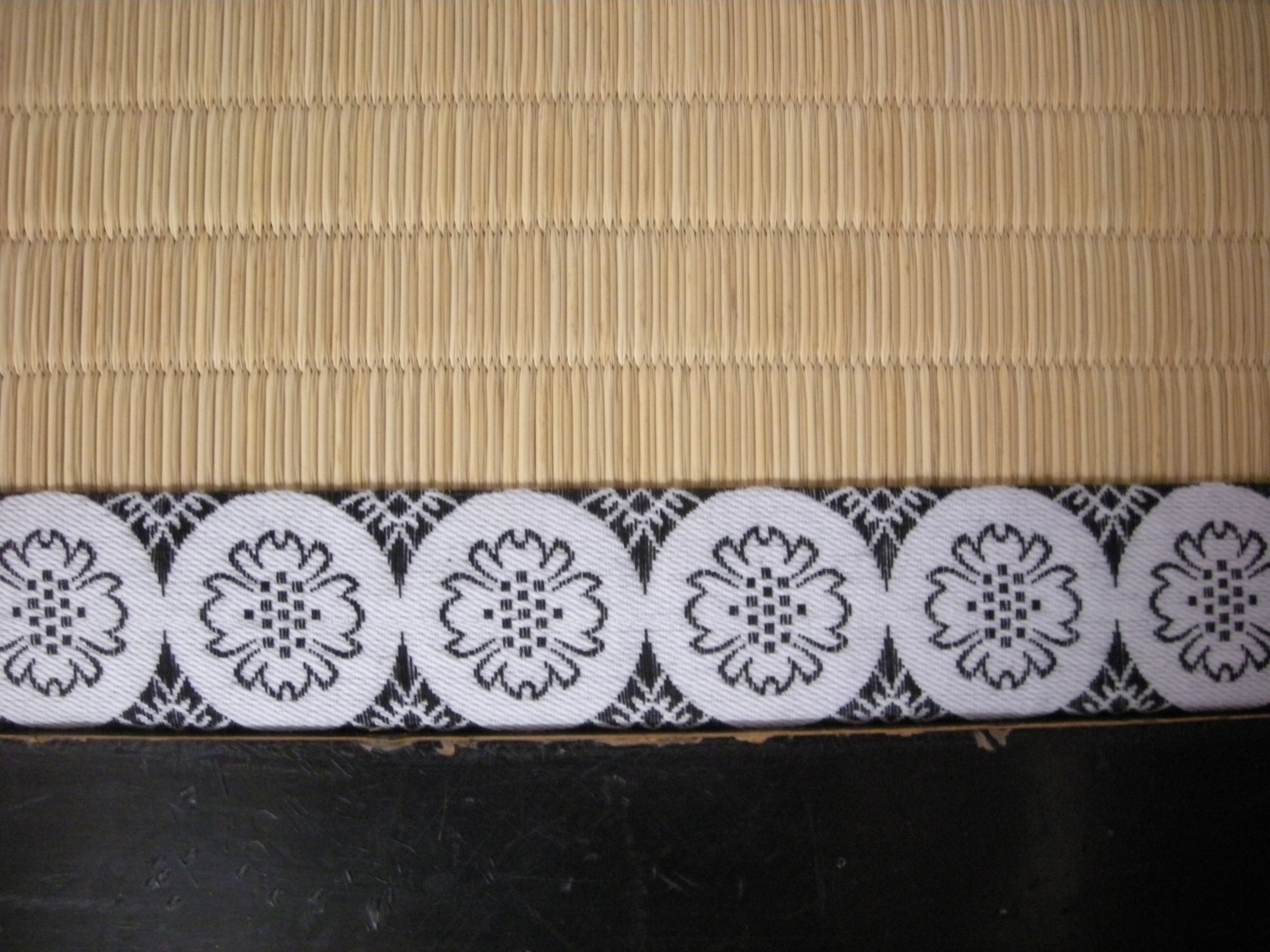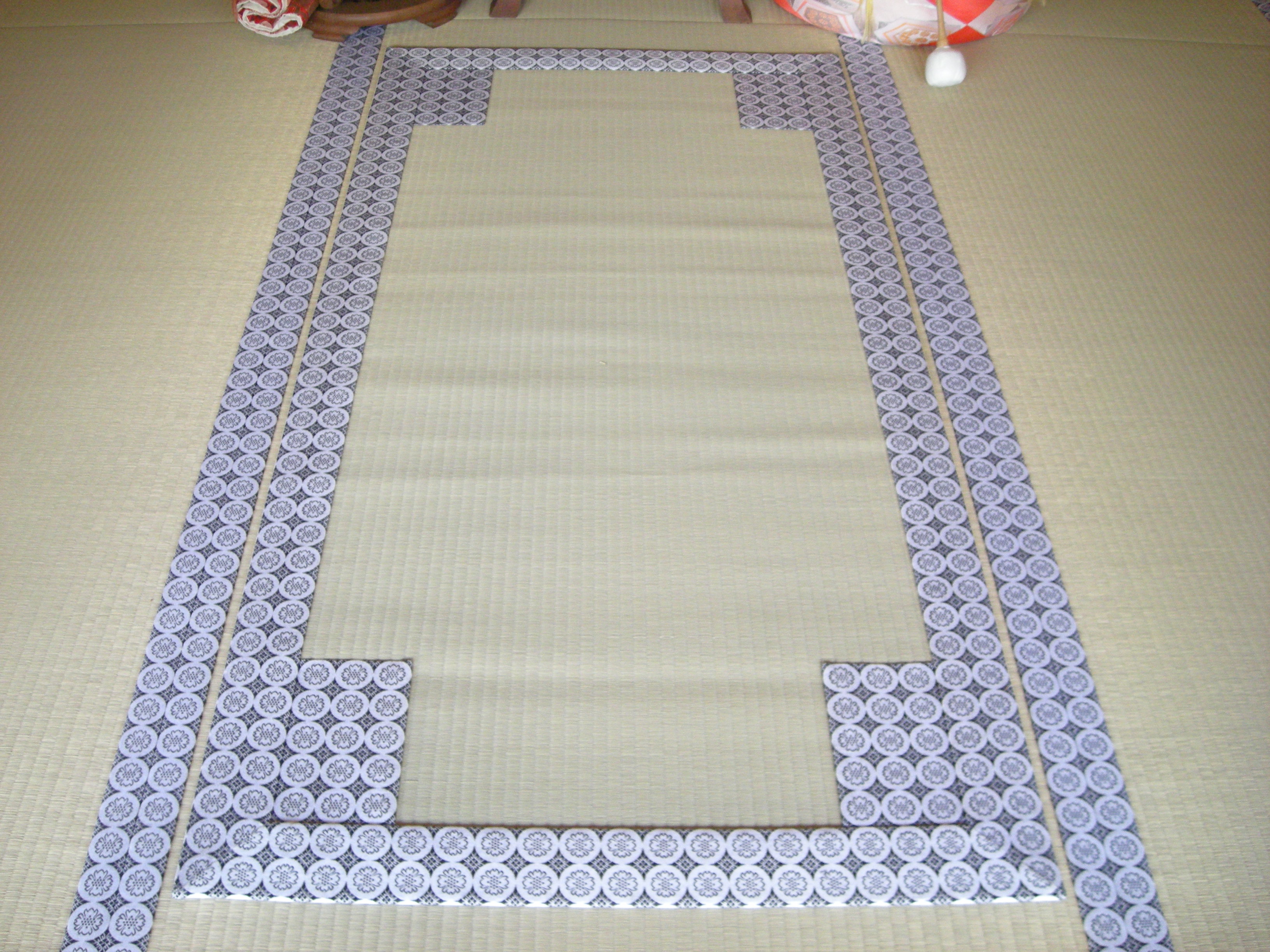 上が白中紋、下が銀七宝です。紋縁は部屋の寸法がどうであれ、隣の畳と柄を合わし、尚且つ敷居際で紋が欠ける事無く納めるのが基本となります。この紋縁を使う仕事を有職造作と言い、手間のかかる仕事ですが畳屋の技量が試される仕事であります。